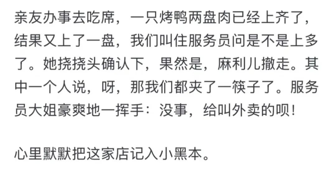 有人吃席,店家重複上了兩份餐。即便動過筷子,服務員也沒覺得有什麼,轉眼將多出來的餐留給了叫外賣的顧客。