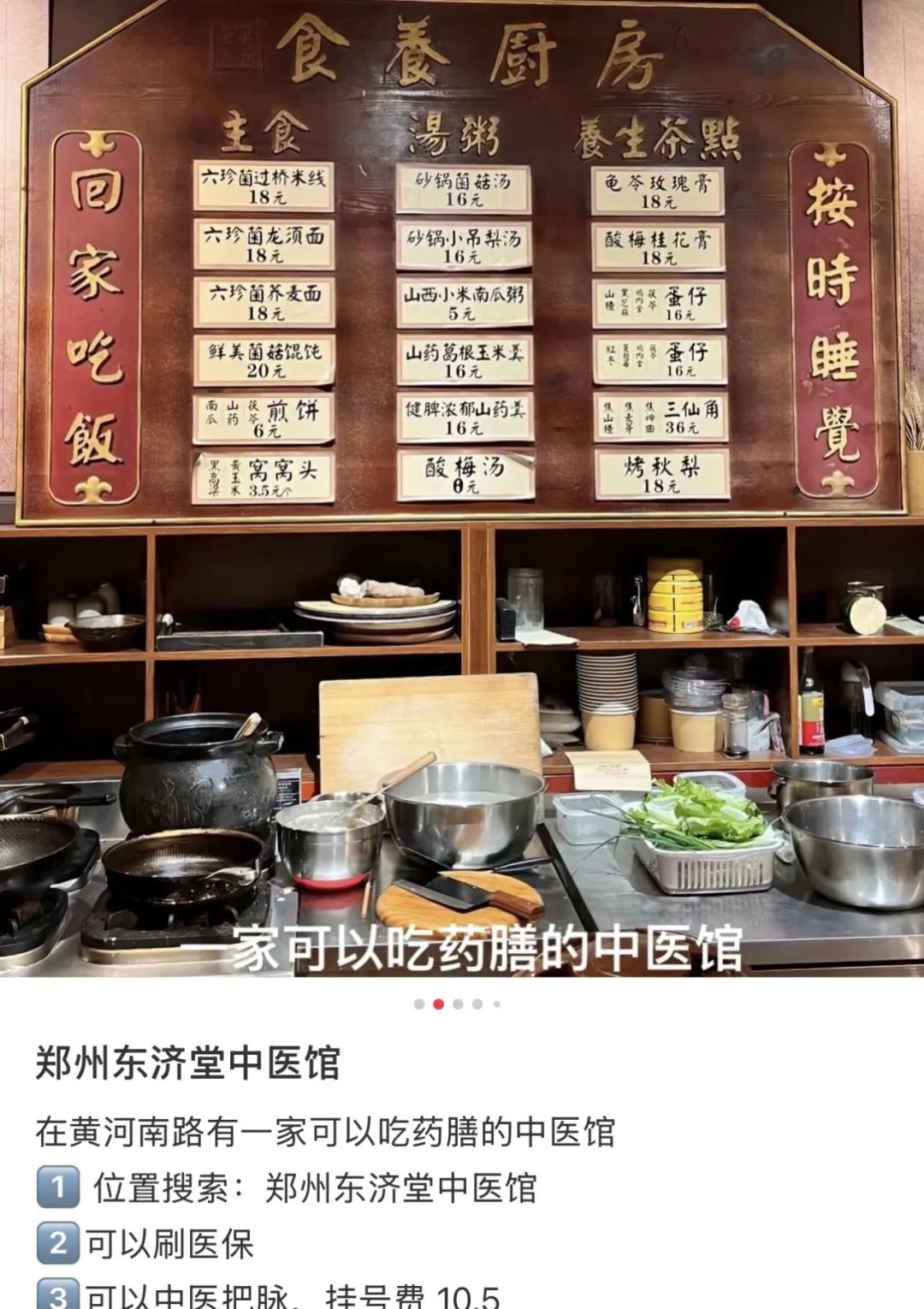 河南鄭州中醫館東濟堂推出了食養廚房,有六珍菌過橋米線、茯苓煎餅、山藥葛根玉米羹、龜苓玫瑰膏;