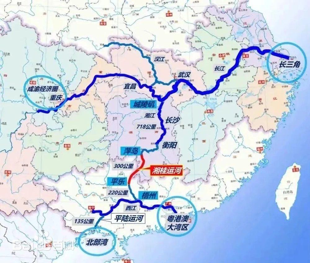到時,像重慶、四川等中西部省份的貨物,都可以選擇經湖南湘桂運河,再從平陸運河抵達北部灣,直達東盟等國家。