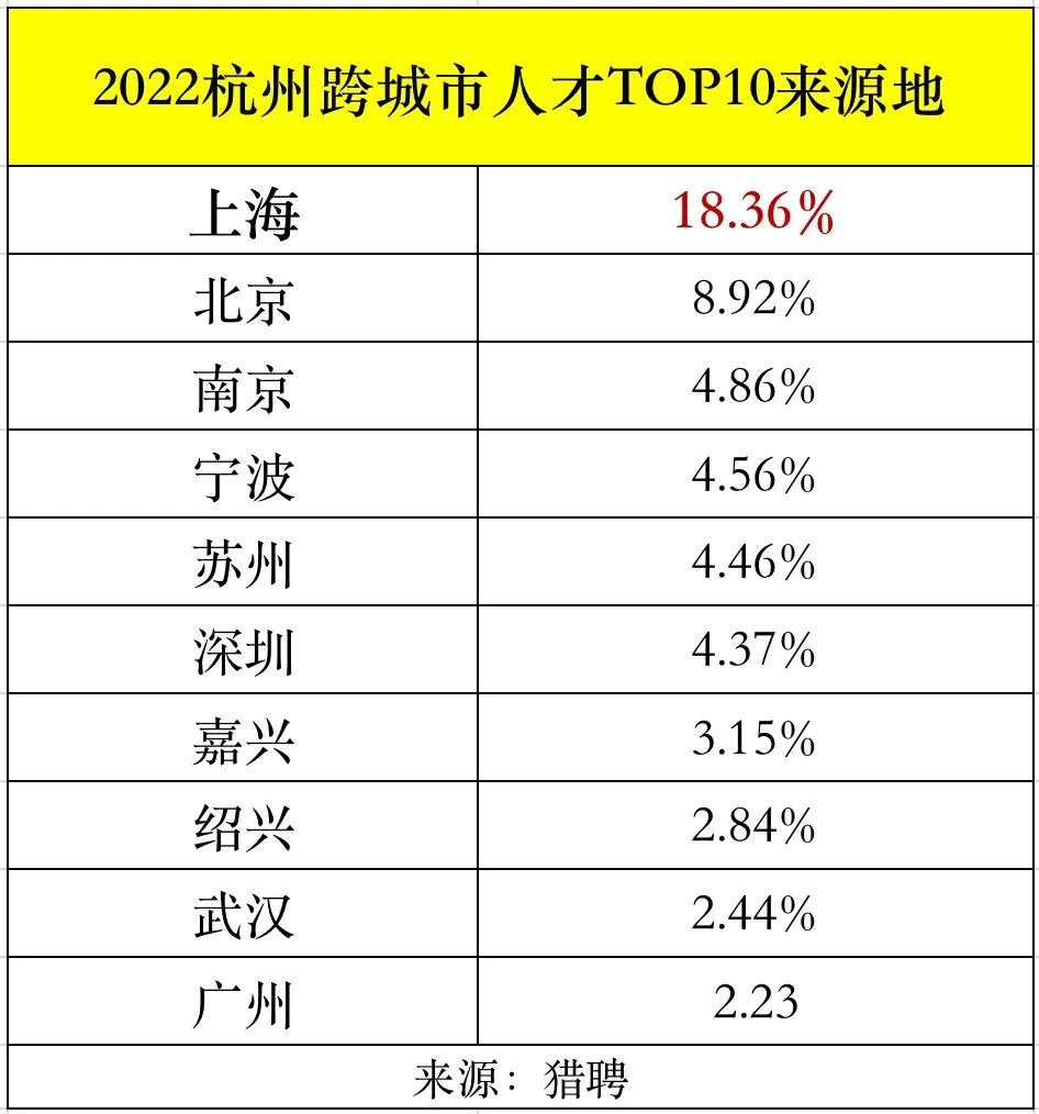 這是獵聘在2022年公佈的一個數據,也正顯示,杭州正在成為上海最大的人才外流接受地