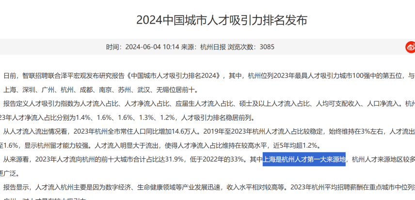 杭州官網自己發佈的新聞,都能看到杭州如今虹吸的就是一線城市人口