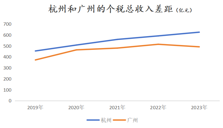 在個税方面,杭州一直領先廣州,排名第四,且個税總額的差距與廣州在慢慢拉大