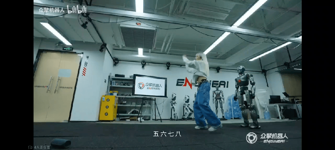 後來為了應對這些質疑,眾擎專門拿出了第三視角的錄像畫面和訓練花絮。結果卻更令人感到驚豔——眾擎的這款機器人對舞蹈動作的學習,似乎並不是依靠手動輸入的程序指令,而是像人類一樣,一邊看着舞蹈老師的示範,一邊自己模仿。