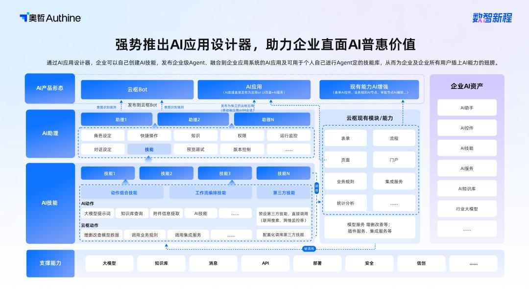 另一方面,奧哲CEO徐平俊在發佈會演講中強調,奧哲已經將AI能力全面融入雲樞All in One低代碼平台,在不同的低代碼模塊調用以及對應場景的服務能力、數據處理能力中,AI已經成為最核心的構成分子之一。