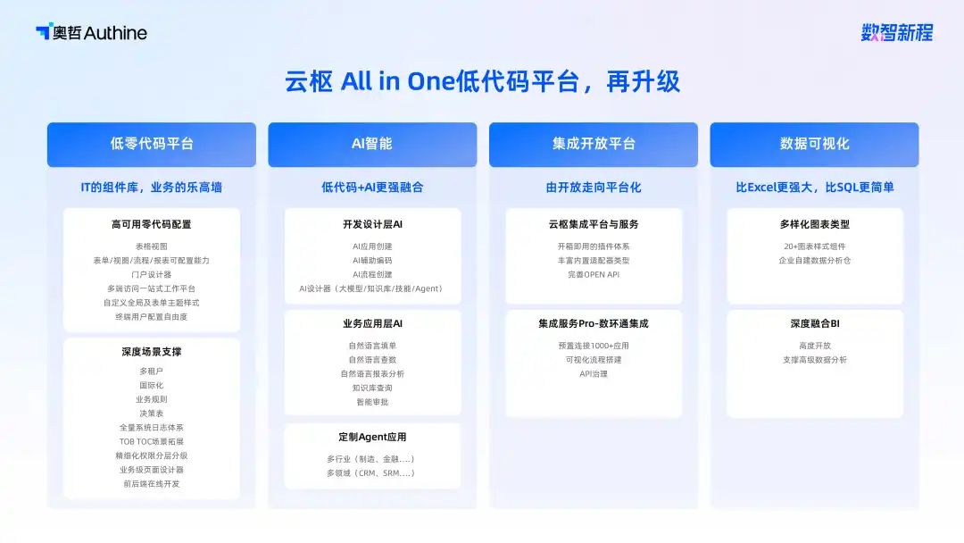 可以理解為,雲樞All in One低代碼平台的進化升級,面向的正是如今企業數字化的難點,為企業迎來數智普惠提供了難以替代的推動力。