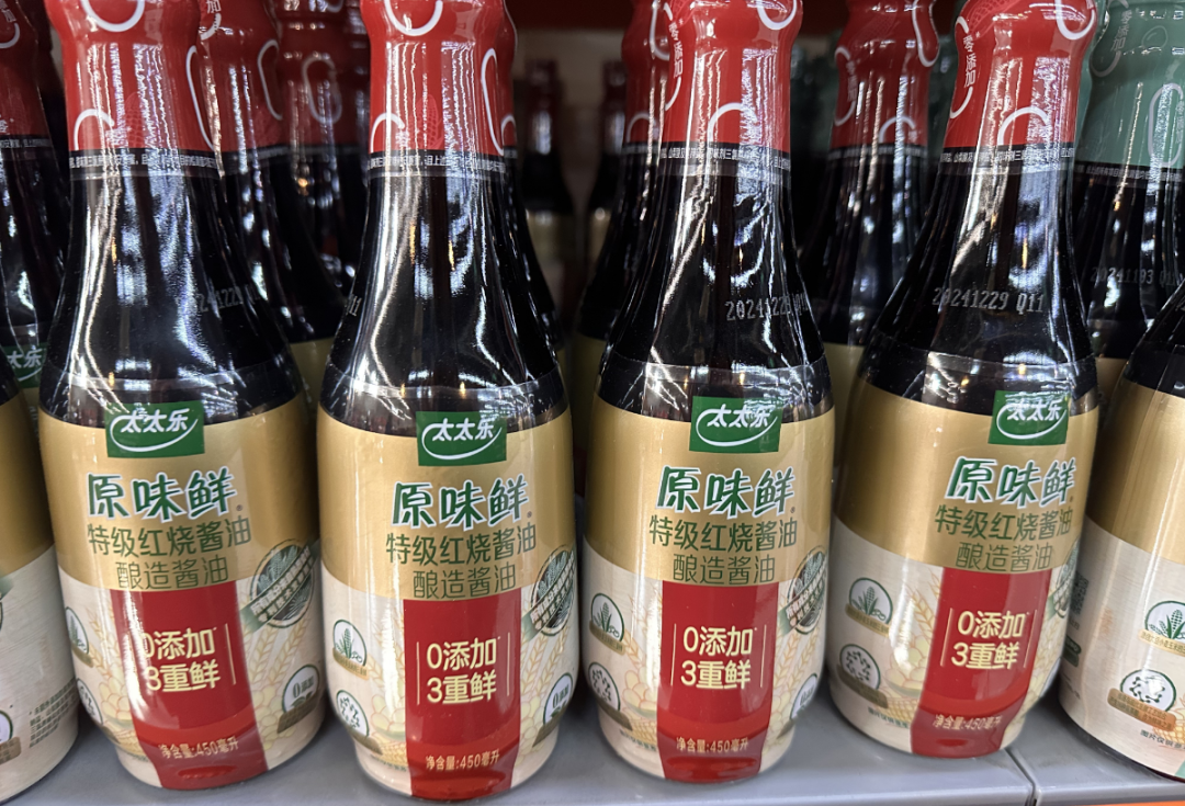 比如,編輯部發現太太樂某款醬油的包裝正面明晃晃寫着 “ 0 添加 3 重鮮 ” 字樣,翻過來找到小字才發現 0 添加特指的是 “ 0 添加苯甲酸及其鈉鹽、山梨酸及其鉀鹽、三氯蔗糖、安賽蜜 ” 這幾種添加劑,而再看配料表,排在第三的便是 “ 焦糖色” ( 一種着色添加劑 )。