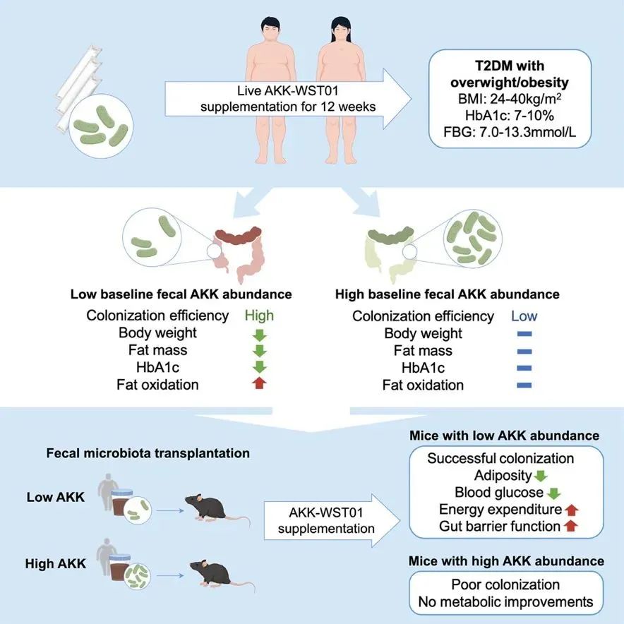 進一步研究發現,AKK菌補充組僅在基線AKK菌丰度低的受試者中實現高效定植,且顯著改善體重、體脂和血糖指標(12周干預降低內臟脂肪7%),而基線AKK菌丰度高的受試者中補充後無臨牀獲益。通過小鼠糞菌移植實驗復現發現,低丰度AKK菌小鼠補充後脂肪氧化增強、代謝穩態改善,而高丰度小鼠無類似效果。
