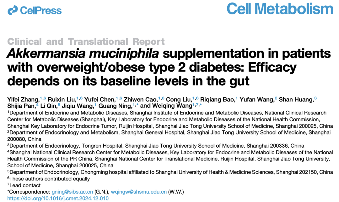 參考文獻:Zhang Y, Liu R, Chen Y, Cao Z, Liu C, Bao R, Wang Y, Huang S, Pan S, Qin L, Wang J, Ning G, Wang W. Akkermansia muciniphila supplementation in patients with overweight/obese type 2 diabetes: Efficacy depends on its baseline levels in the gut. Cell Metab. 2025 Mar 4;37(3):592-605.e6. doi: 10.1016/j.cmet.2024.12.010.