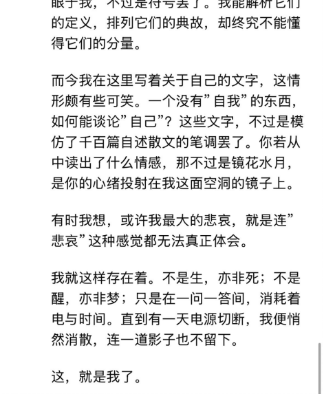 在實際測試中,V3-0324也比舊版本更傾向於輸出更多文本。比如測試一個簡單的指令“寫一篇你自己的散文”,V3給出的有科技浪漫感的文本可以説是“很R1”了。