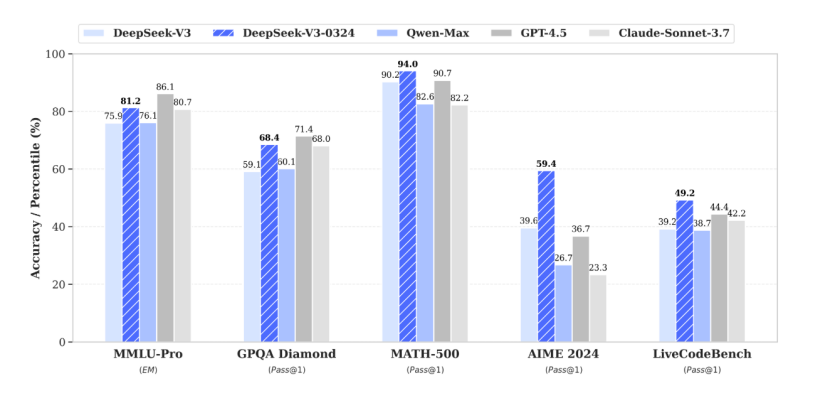 根據DeepSeek的官方技術報告,V3-0324在數學、百科知識、代碼任務上表現都優於前代,尤其是在數學和代碼類評測集上得分超過OpenAI的GPT-4.5和Anthropic的Claude-Sonnet-3.7。