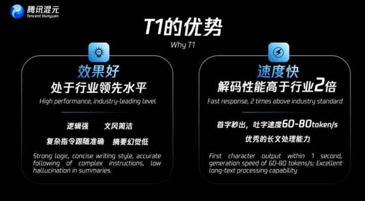 騰訊的混元T1正式版也有異曲同工之妙,從架構層面融合,使得其作為推理模型反應速度顯著提升,與此同時能更好地處理上下文。DeepSeek嘗試讓通用模型向推理模型的方向走了走,騰訊則讓推理模型向通用模型的方向走了走,兩端都在向中間靠攏。