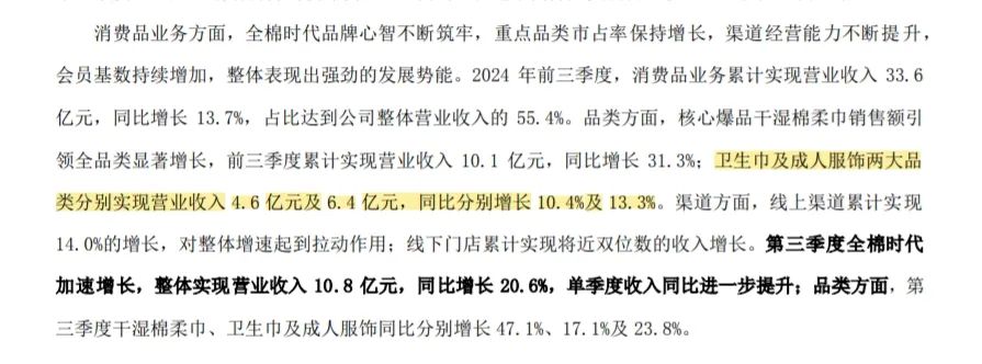 2024年前三季度,全棉時代母公司穩健醫療衞生巾品類的營收為4.6億元,同比增長10.4%,第二和第三季度,該品類的營收增速分別達到16%和17.1%。