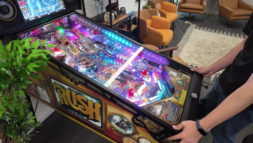 辦公區中的Rush樂隊彈珠枱,是老闆邁克·莫漢的私人收藏