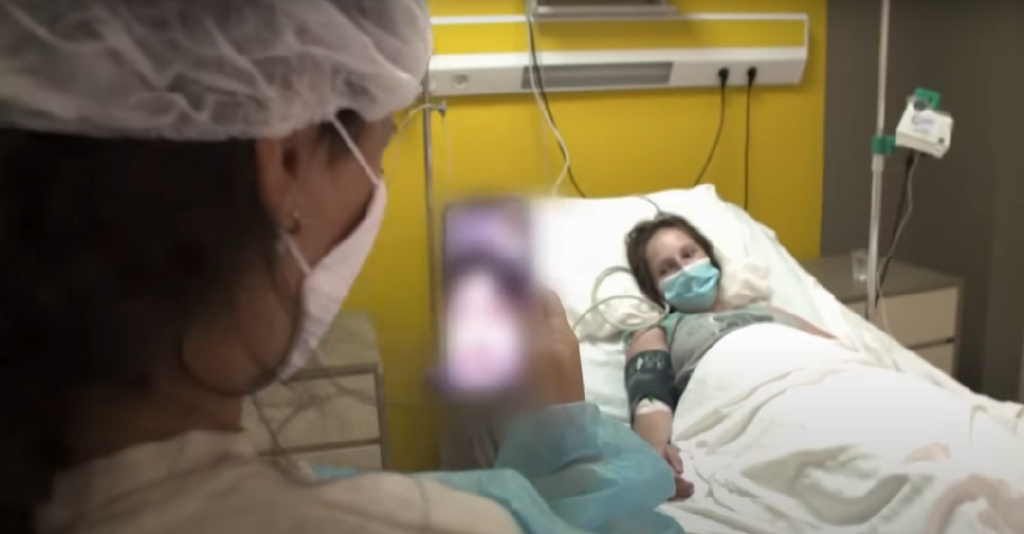 〓 機構的護士向客户遠程展示剛分娩完的孕母