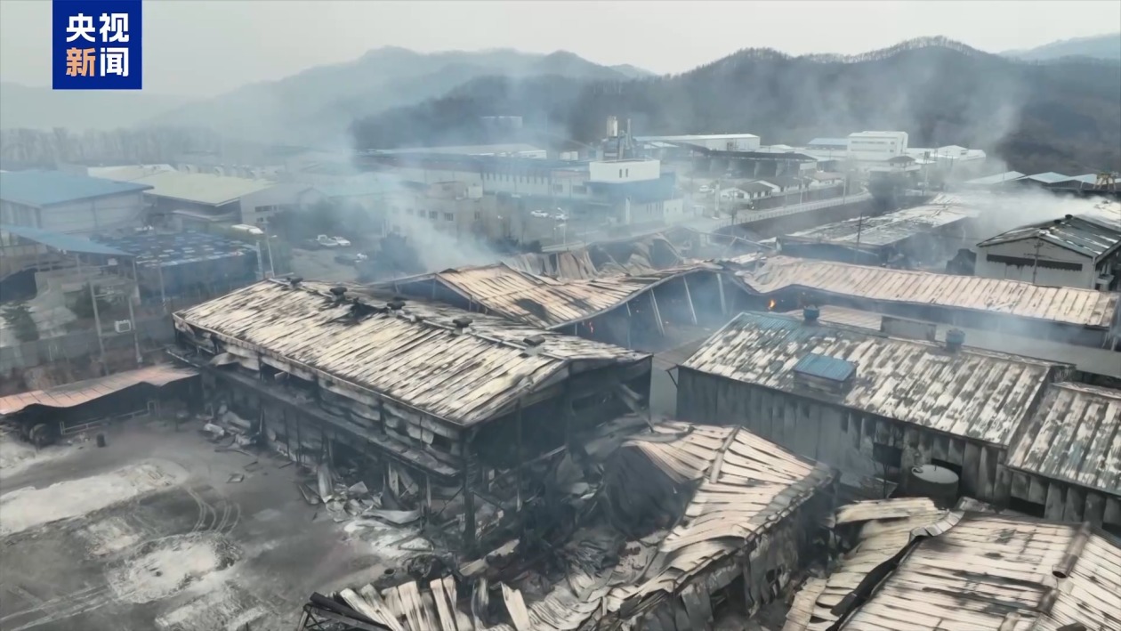 總枱記者 唐鑫:我們現在來到了慶尚北道安東市一處工廠的所在地。通過鏡頭可以看到,在目光所及範圍之內,這家工廠幾乎所有建築都在山林大火中被燒燬。根據目測,整個廠區有數千平方米,在現場還能看到濃重的黑煙,我也能聞到刺鼻的氣味。這一次山火不僅是給森林,也給當地民眾生活以及工廠等造成嚴重損失。