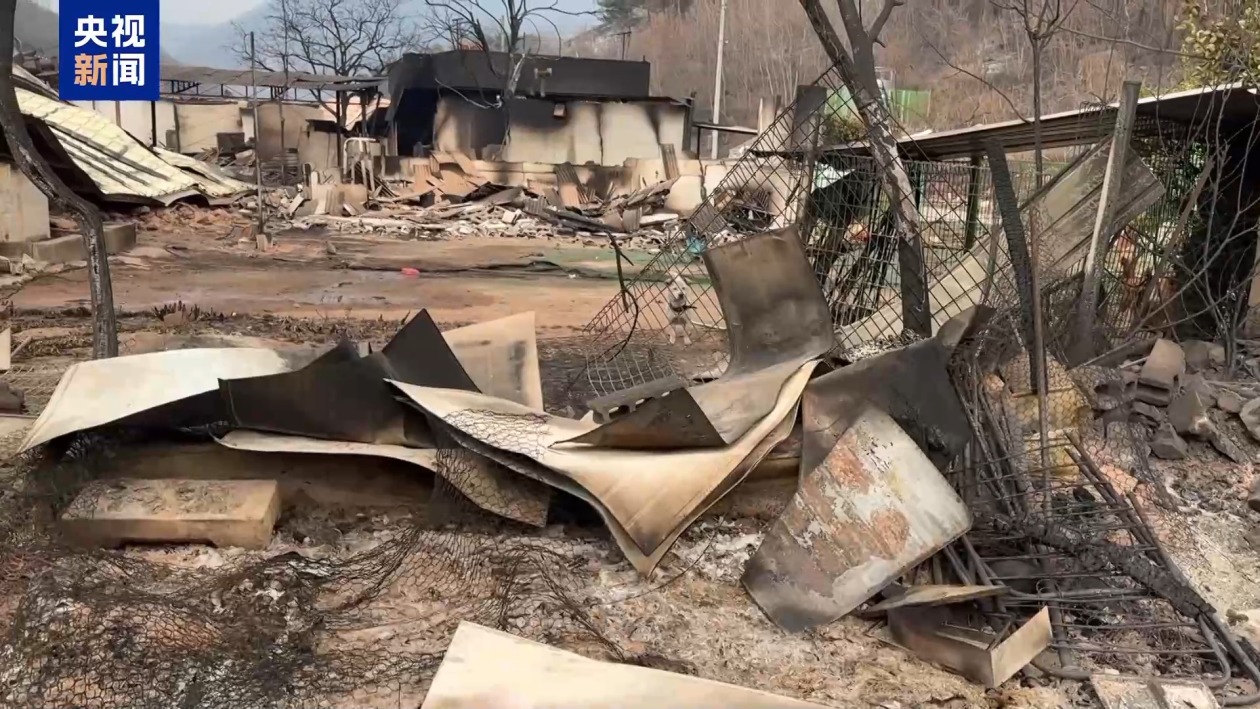 在慶尚北道安東市郊的一片山林附近,記者看到山腳下的村莊已幾乎完全被山火摧毀。居民的房屋、拖拉機等農用機械燒燬嚴重,生活用品四處散落,隨處可見物品被燒燬後的焦黑,空氣中仍舊充滿刺鼻氣味。