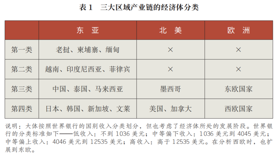 在東亞、北美、歐洲三大區域產業鏈中,東亞區域產業鏈的獨特優勢是經濟體類型更豐富。區域產業鏈的發展潛力主要取決於梯次結構,即區域內不同經濟體處於產業鏈的不同位置,形成產業種類和不同環節的互補性。按照各經濟體人均國內生產總值、所處工業化的階段和產業鏈的位置,可以將其劃分為如下四類:第一類,工業化待啓階段;第二類,工業化快速發展階段(產業鏈低端);第三類,工業化完成階段(產業鏈中端);第四類,工業化完成階段(產業鏈高端)。在北美區域產業鏈中,美國和加拿大屬於第四類,墨西哥屬於第三類。在歐盟區域產業鏈中,東歐國家屬於第三類,西歐國家屬於第四類。很顯然,北美和歐盟區域產業鏈均缺少第一類和第二類經濟體。在東亞區域產業鏈中,老撾、柬埔寨、緬甸屬於第一類,越南、印度尼西亞、菲律賓屬於第二類,中國、馬來西亞、泰國屬於第三類,日本、韓國屬於第四類。文萊比較特殊,依賴其豐富的石油和天然氣資源成為發達國家。新加坡既可以劃歸為第四類,也可以將其視作提供高端服務業支撐的發達經濟體。這意味着東亞區域產業鏈的產業種類、分工深度和發展潛力都優於其他兩大區域產業鏈。