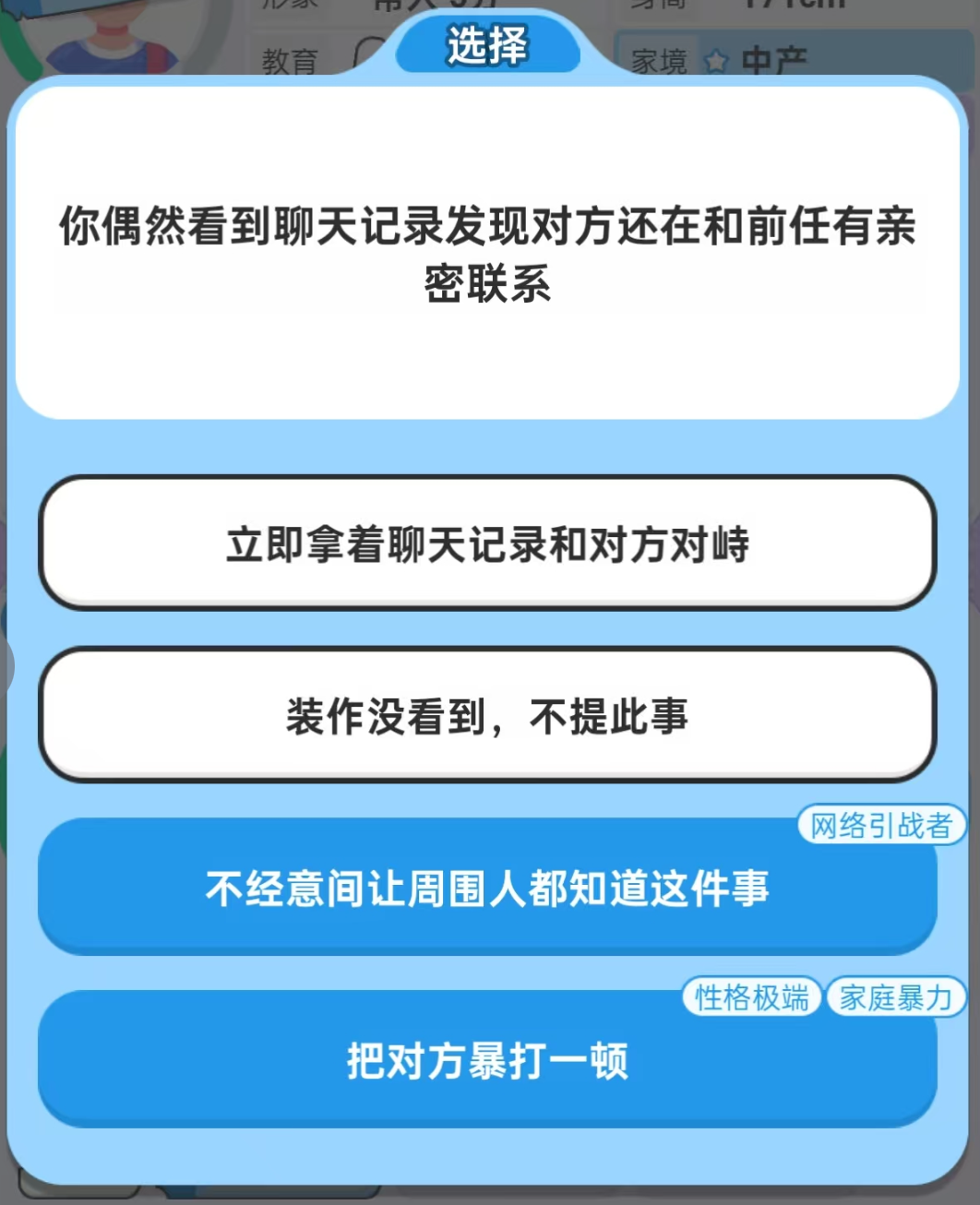如前所述,遊戲的實際運作模式就是通過標籤來帶來不同單局的體驗的,但是除了剛剛我們提到的家境,身高,學歷,性格等常規的相親標籤之外,還有更多更細緻的標籤隱藏在遊戲的進程之中。