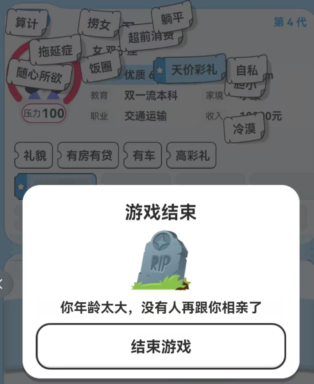 遊戲的機制看上去並不複雜,你選擇一個角色,系統會隨機對角色的職業身高,長相,收入,家境等進行分配;此外,角色會擁有幾個不同的標籤,分別會影響遊戲每一個“單局”裏的表現。