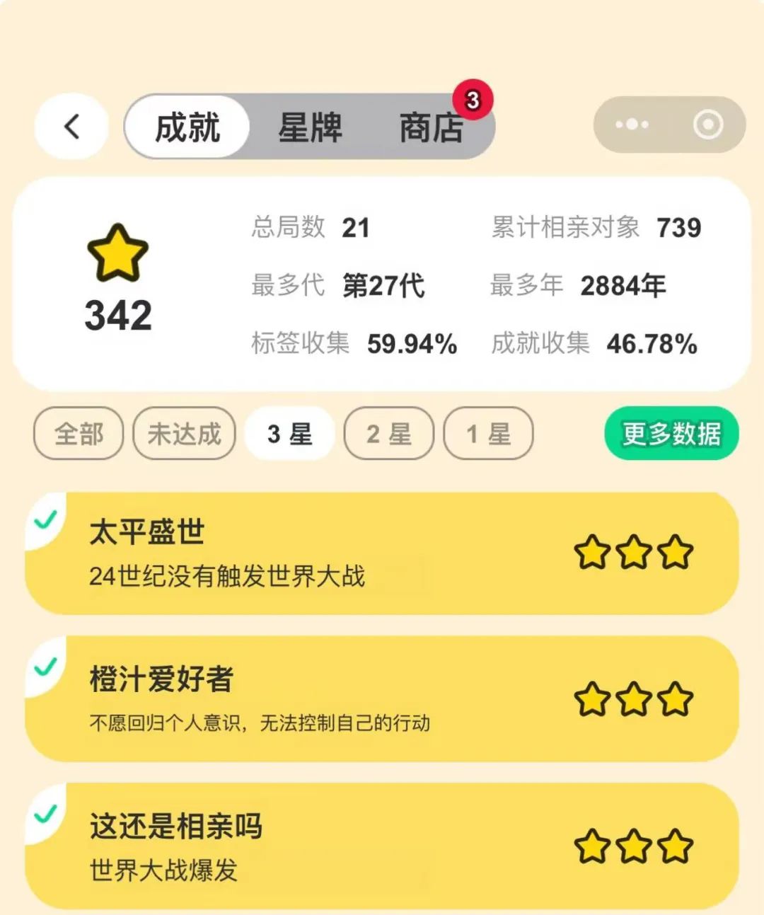 這時候你才會發現,《紙上談親》這款遊戲遊戲真正做的,是由相親背景做的包裝下,實際上玩的是“半隨機(即隨機+遺傳)標籤+隨機事件”的類肉鴿文字體驗。而遊戲龐大的標籤和事件的體量以及這些標籤組合帶來的特殊效果,更是能讓人長時間玩下去的重要因素——你會發現,在完成了看似很多成就之後,遊戲仍然有近一半內容未被探索。