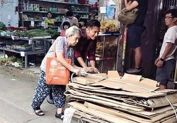 謝霆鋒,幫撿紙皮的老人家推推車。