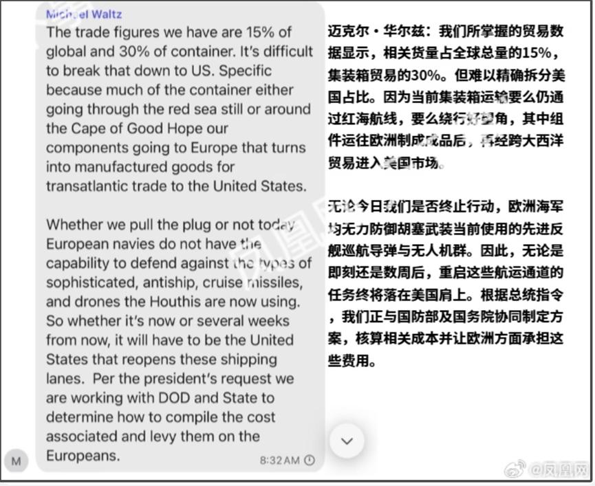 華爾茲把SM拉進來後,又説了一段話:“正如我們在首次作戰會議中所述,我們面臨一項根本性決策:是任由海上通道持續關閉,還是立即或延後重啓。遺憾的是,目前唯有我方具備此行動能力。從戰略傳播角度而言,此事必須納入歐洲防務投資必要性的危機論證清單,以突顯其海上防禦體系的致命缺陷。”