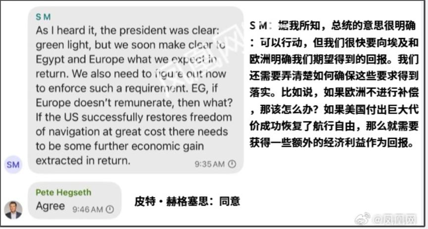 赫格塞思在萬斯同意後就説:“副總統,我完全理解你對歐洲坐享其成的厭惡。這太可悲了。但華爾茲説得對,我們是世界上(在我們這一方)唯一有能力做到這件事的國家。沒有其他國家能與之相比。問題在於時機。鑑於總統要求重新開放航運通道,我覺得現在是個不錯的時機。我認為我們應該行動,但總統還有24小時來做決定。”