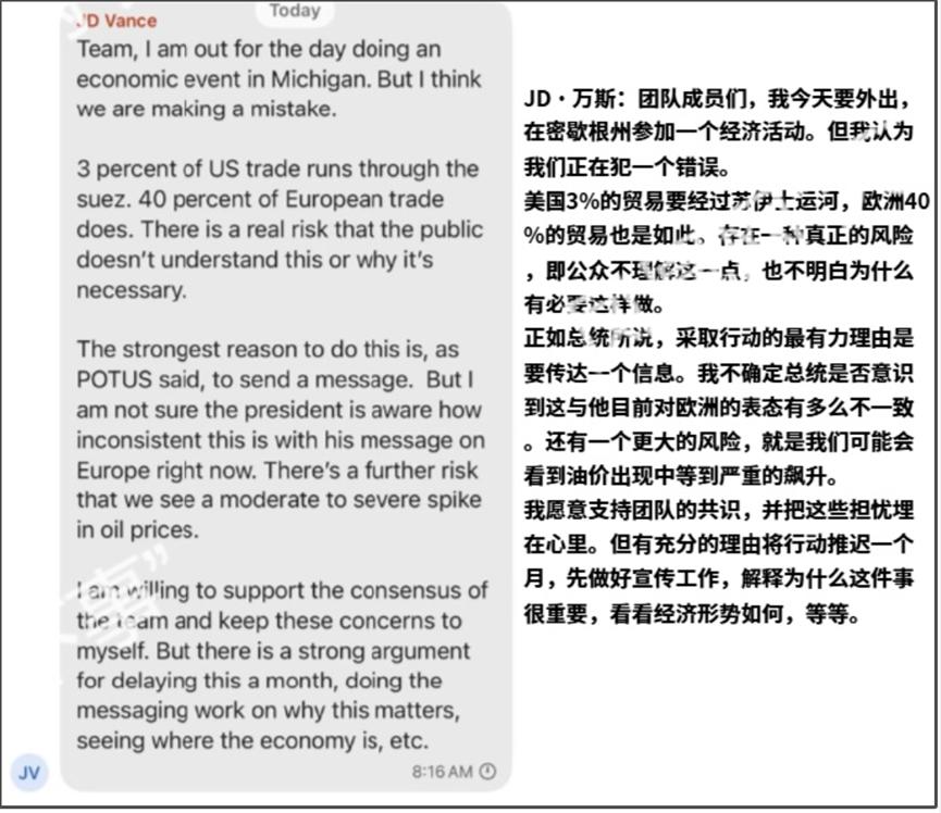 也就是説,之前的討論,特朗普心腹並不在羣裏,等於羣裏都是老闆之外的人,這可能是萬斯敢大膽諫言的原因。