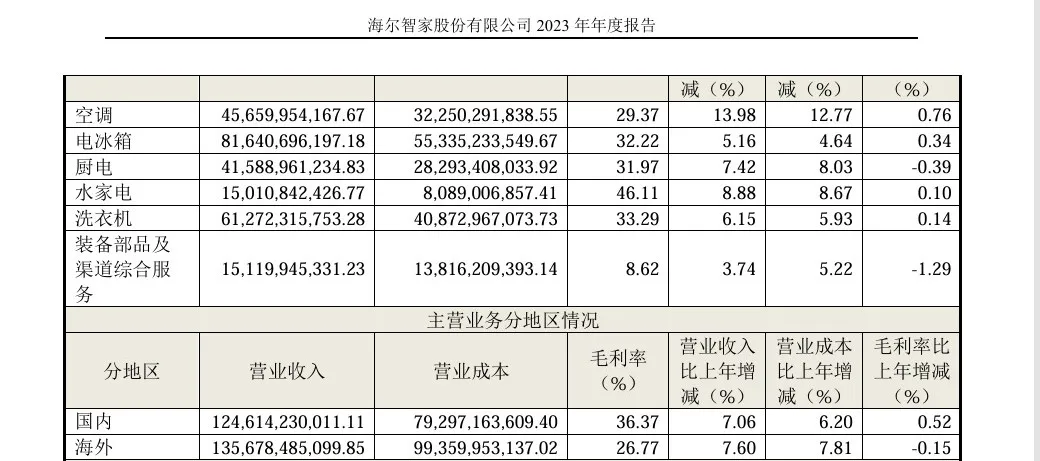 事實上,海爾智家這些年國內市場這一基本盤對整體營收的拉動力度,無疑在降低:從2022年到2024年,海爾智家國內市場營收分別為1167億、1246億、1416億,同比增速分別為4%、7%、3%。尤其考慮到2024年還有提振消費的國補強有力加持,可仍無法扭轉海爾智家的失速,這也意味着,幾年來李華剛主政下的海爾智家,從國外市場到國內市場,整體均處在守勢。不過,為了扭轉被動態勢,海爾智家也做了不少嘗試。例如,海爾智家在國內市場一直以“海爾”+“卡薩帝”雙龍頭品牌為主要發力點,品牌調性趨於高端,在此作用下,海爾智家運作模式往往是高端化、高利率壓過規模化,可隨着近兩年國內市場競爭加劇,海爾智家也不得不選擇走上以價換量的道路。市場進入存量爭奪後,海爾智家以往堅持的“高端化”路線,也開始打了折扣,加上品牌老化帶來的後遺症凸顯,這一時期,海爾智家也不得不深化Leader品牌的戰略投入,聚焦在年輕消費羣體的品牌心智構建,從而提升自身規模增長。可也是受此影響,2024年海爾智家其空調、電冰箱等產品整體毛利率表現均有不同程度下滑,2024年國內市場毛利率達到29.79%,相較2023年下降近7個百分點。2024年全年,海爾智家的整體毛利率也來到27.8%,跌破以往多年保持的30%毛利率大關。並且,2024年第四季度海爾智家開始以價換量後,其營收規模未能顯著增長的同時,其淨利潤也受到了較大侵蝕:2024年第四季度海爾智家淨利潤35.87億,相較2023年同期34.48億同比僅增長4.03%,環比增速卻大幅下滑了24.22%,這也意味着,2024年第四季度,哪怕在國補強大加持下的海爾智家,為了達成這3.4%的營收季度增速,卻在盈利端付出了極大代價。三、誰是海爾未來發動機?