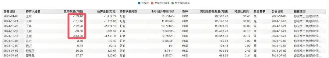 Wind數據顯示,王燁在2024年至2025年1月,多次行權並賣出股票,套現約1億港元。