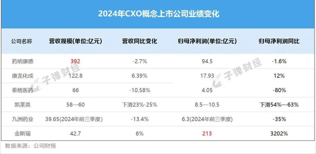 A股前五名CXO企業中,除康龍化成外,藥明康德、泰格醫藥、凱萊英均有不同程度的下滑。九州藥業還未披露2024年業績預告,但從前三季度來看,公司業績也出現了下滑。