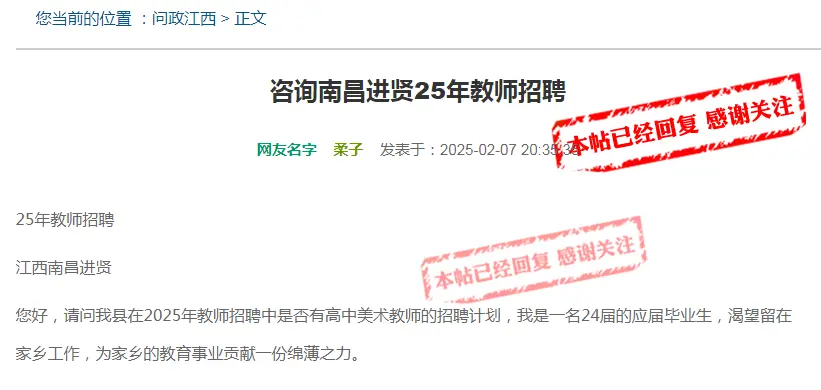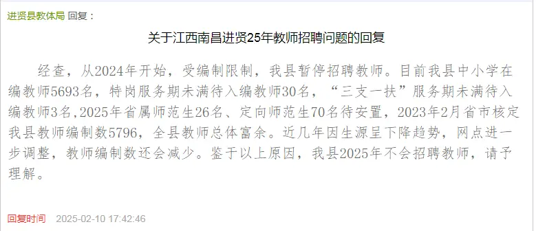今年2月,有網友在“問政江西”留言諮詢南昌進賢縣教師招聘情況。該縣教體局留言答覆:受編制限制,自2024年起,該縣暫停招聘教師。