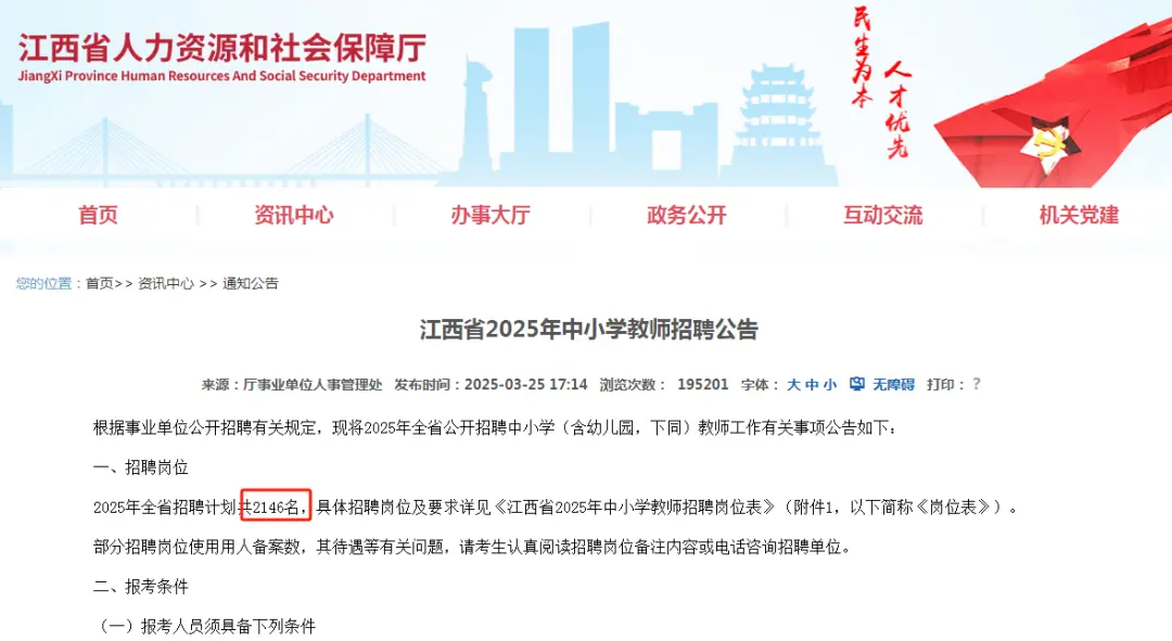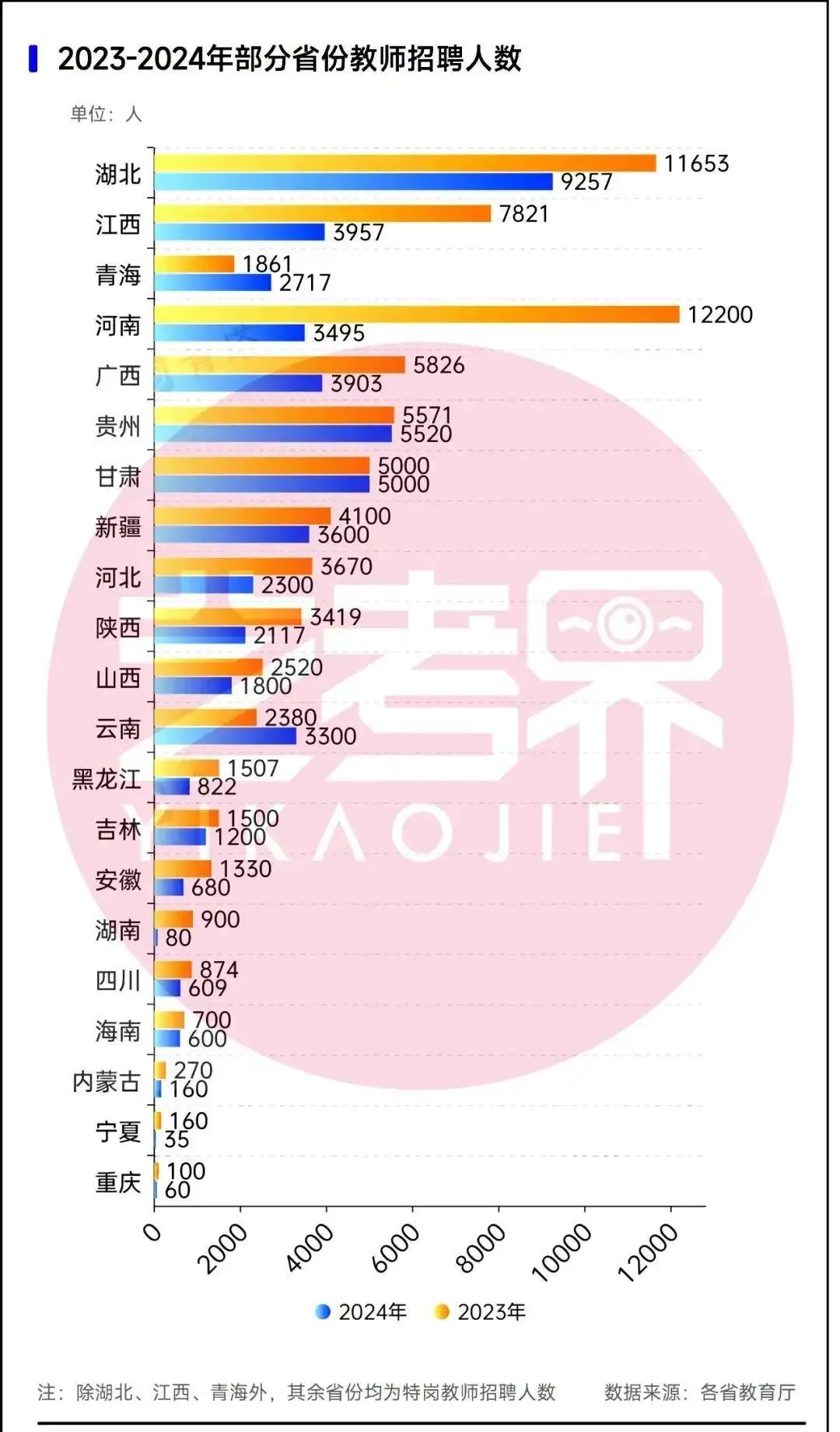 值得注意的是,2023年以前,江西每年教招人數幾乎都在萬人以上,2023年招聘人數是7821人,而2024年則下降至3957人,減少54.7%,而今年,是在去年的基礎上又幾乎腰斬。