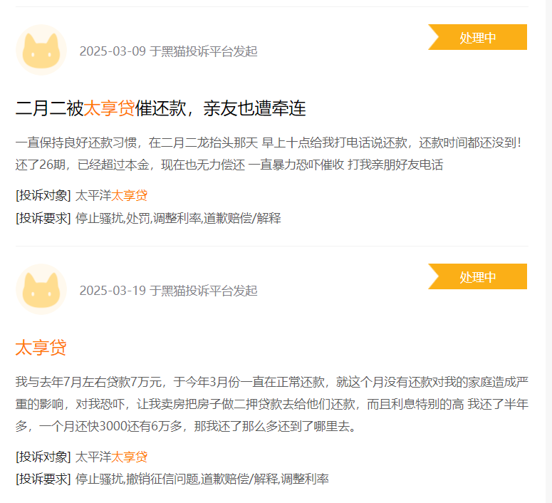 例如,在黑貓投訴平台上,以 “太享貸” 為關鍵詞搜索,相關投訴記錄多達千餘條。消費者在投訴中不僅對產品的不合理收費表示不滿,還對其服務質量、催收方式等提出質疑。