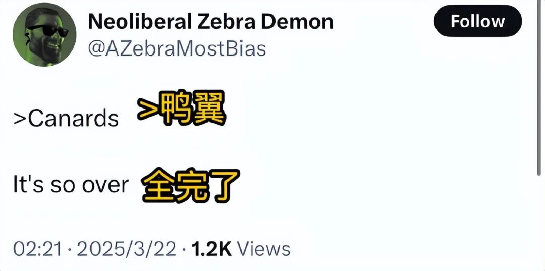 “我發誓,美國人現在肯定要開始給他們家隱身戰機上的鴨翼洗地了。”