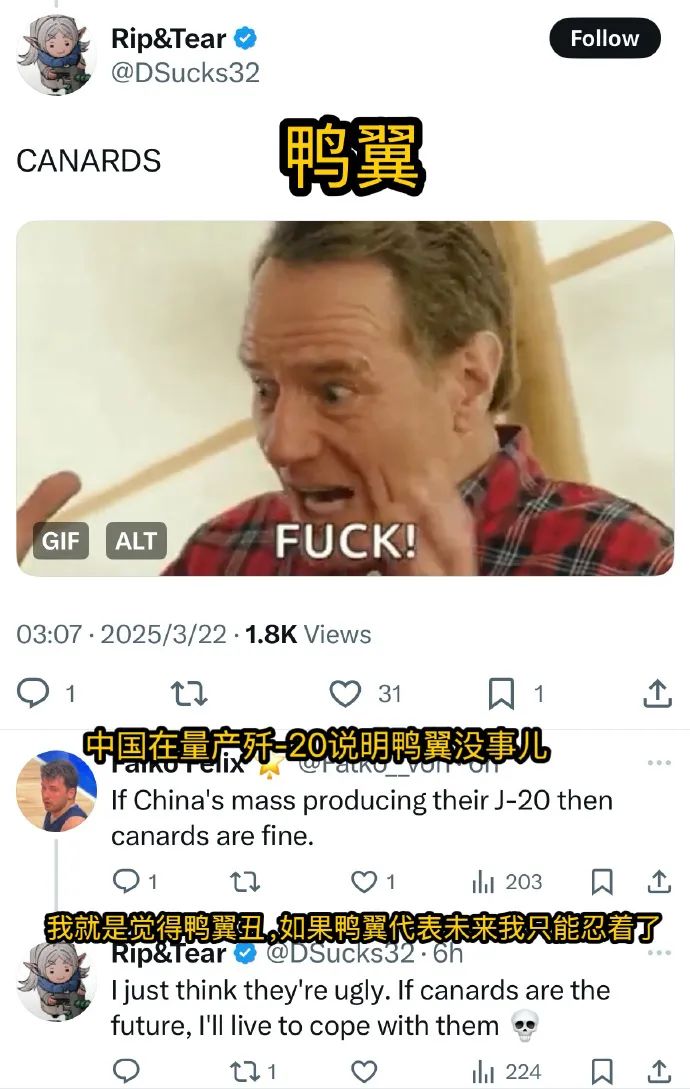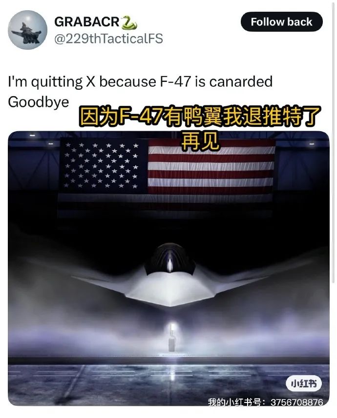 “我接受不了我們的F-47居然長着一對鴨翼,再見了家人們,這破X我不玩了。”