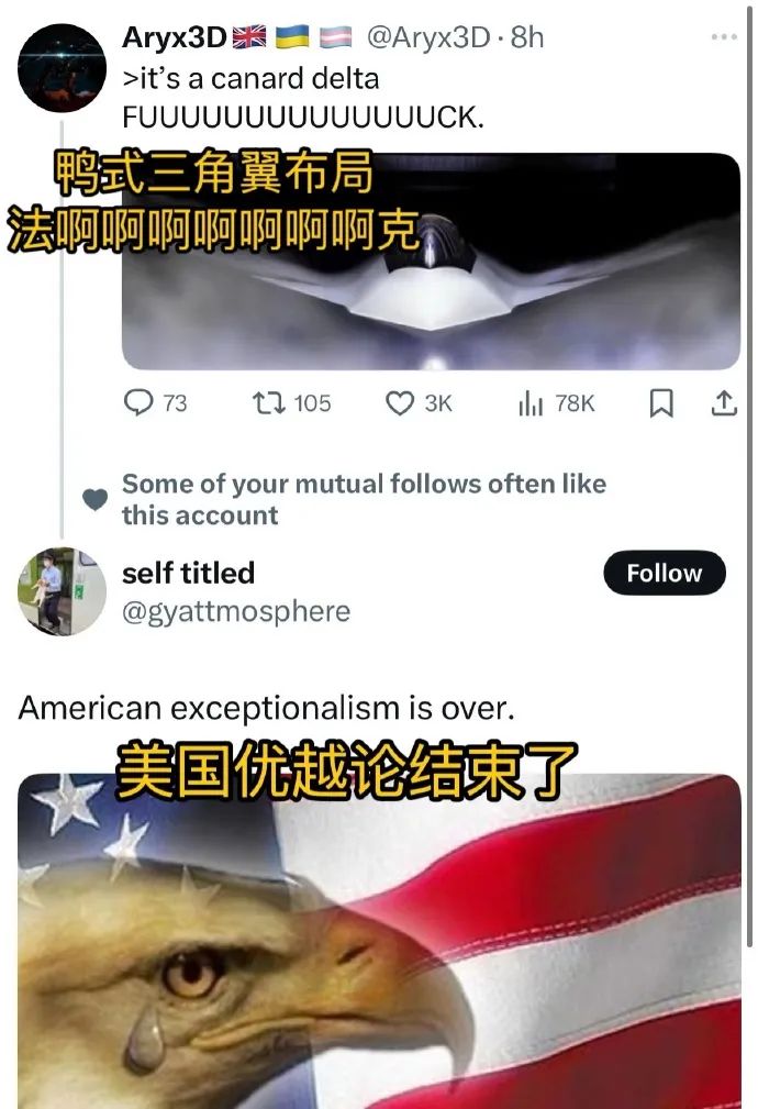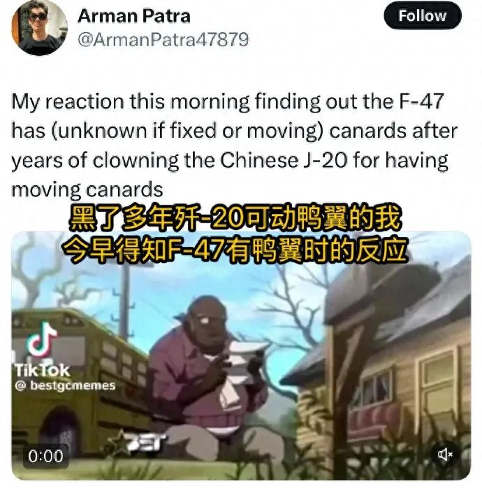“嘲諷了那麼多年殲-20的可動式鴨翼,今早得知我們美國的6代機F-47可能也採用了類似設計,我有種一覺醒來天都塌了的幻滅感。”
