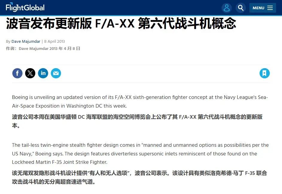 在2013年4月於華盛頓舉行的海軍聯盟海空天博覽會(the Navy League’s Sea-Air-Space Exposition)上,波音曾經展示過一個在當時看來堪稱離經叛道、有違祖宗之法的6代機設計。按照波音當年的説法,這款無尾鴨翼6代機是專為美國海軍預想中的下一代艦載機F/A-XX設計出來的,生來就是要上航母的。那是一種採用鴨翼、雙側DSI進氣道和無尾佈局的隱身飛機,該機系一機兩型設計,分為有人機和無人機兩種型號。