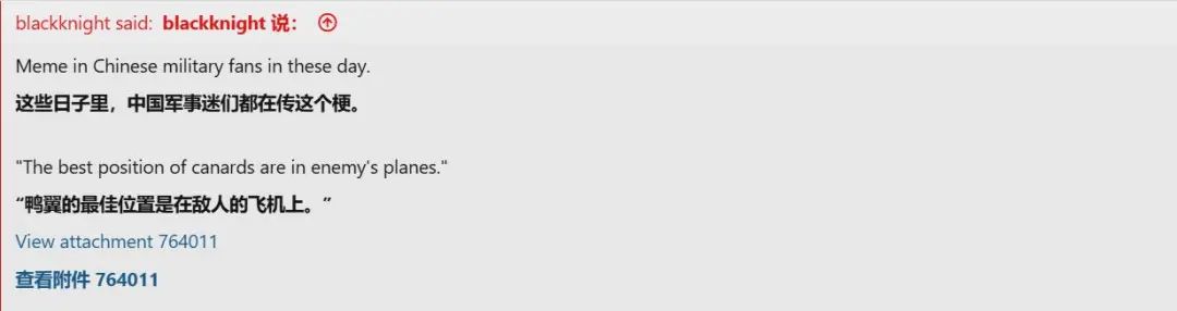 “你們知不知道?在過去這些天以來,中國軍迷很多都在傳那個著名的梗圖——最好的鴨翼就是長在敵人飛機上的鴨翼。”