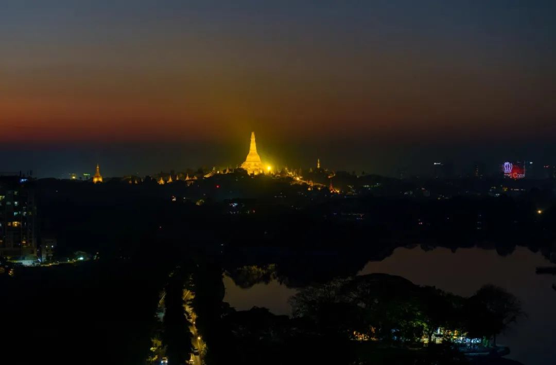 這樣的“狂歡”也是短暫的。作為一座還在實行宵禁的城市,強震後的仰光市政供電時間鋭減至每日僅有4個小時。凌晨1點,一切重歸寂靜,燈光熄滅。在窗邊俯瞰這個城市,只有遠處的大金塔依然燈火通明,像一座金色的燈塔,在黑暗中給予人們一絲心靈的慰藉。
