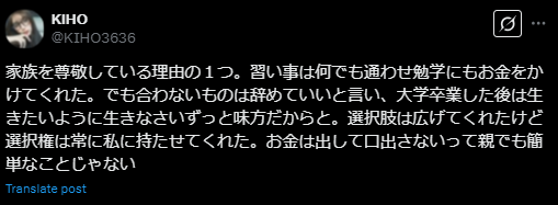 從kiho醬的發文不難看出,從小她就是在一個充滿了愛、自由和充足的金錢家庭中長大的。不過上高中時,kiho醬似乎沒有什麼朋友,也從不參加任何社團活動、不與很多人交往。那時的她,一心只想讀書。
