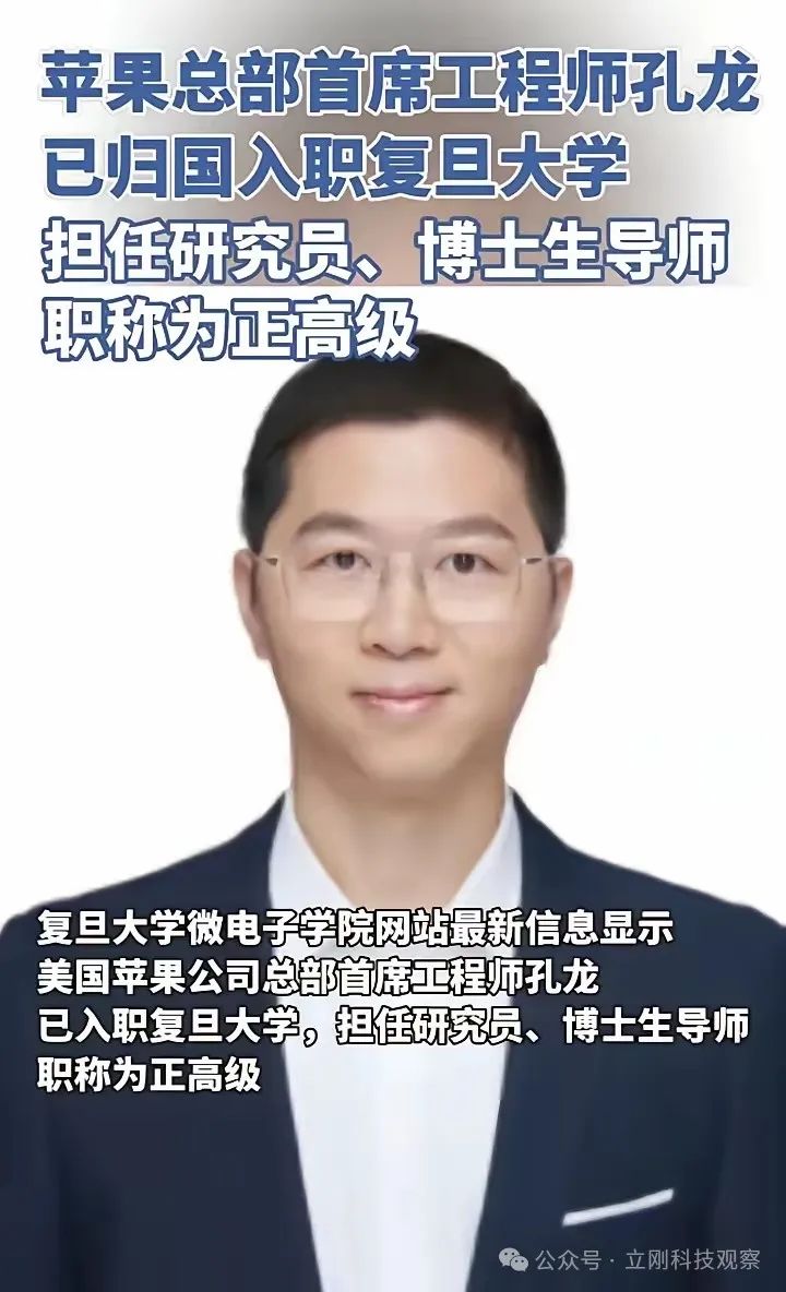 看到消息,蘋果的芯片工程師孔龍回中國,到復旦大學任教,擔任研究員和博士生導師,這個消息我挺高興的,我想這是一個皆大歡喜的消息。