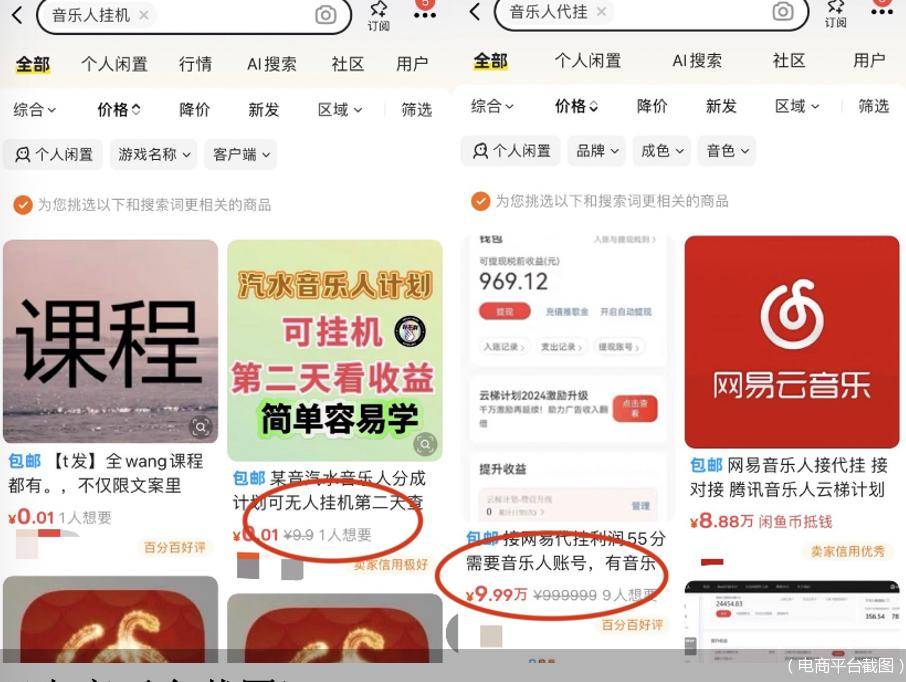網易雲音樂官方微博日前發文打擊“聽歌外掛”行為,並針對找“代練”自動刷歌的1萬+賬號進行了治理。北京商報記者調查發現,“聽歌外掛”行為背後隱藏着一條“音樂人計劃”利益鏈,在小紅書、閒魚等多個電商平台上,存在大量“外掛”課程、“代掛”服務以獲取平台推出的“音樂人計劃”中的播放量激勵收益,相關課程價格在1分錢到上萬元不等。有商家還稱,每天簡單操作半小時,就能月入過萬元。但同時,越來越多的消費者反映自己被割韭菜,甚至還有消費者在“幫原創歌手打榜賺零花錢”的羣裏被騙走30萬元。律師分析指出,投機者利用虛擬播放器和自動化工具虛增播放量的行為將面臨刑事、民事等多重風險,可能構成詐騙罪。