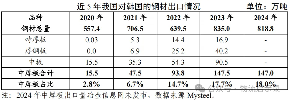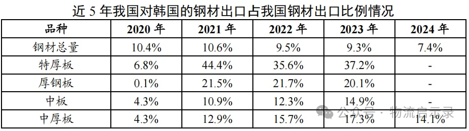 我國對韓國鋼材出口佔我國鋼材出口比例情況(2020-2024年)(圖源冶金工業規劃研究院,侵刪)