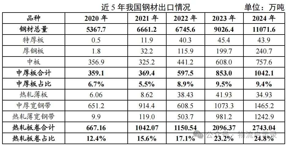 -熱軋板卷出口2743.04萬噸(同比增長30.8%),佔鋼材出口總量的24.8%。