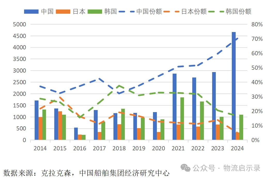中日韓造船業全球市場份額(圖源克拉克森、中船研究中心,侵刪)