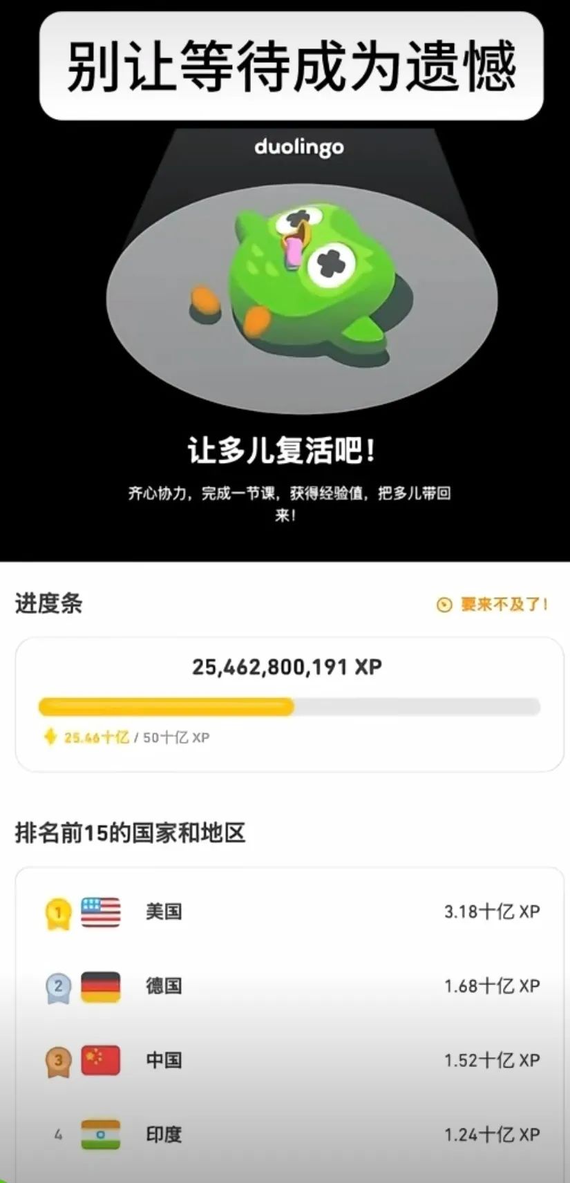 與之對應的是,玩梗、發瘋的營銷成為引流的有效方法:“瘋狂星期四”文學的狂歡讓肯德基在2023年第二、三季度每週四的銷售額分別比其他工作日高出50%和40%;2025年初一場吉祥物多兒假死的營銷,在一週內為多鄰國帶來了全球範圍數十億實打實的流量——2月18日,多鄰國稱吉祥物復活需要用户打卡達成500億經驗值(每個用户在一次挑戰中能夠獲得的經驗值為10~20),2月25日凌晨,多鄰國官方宣佈這一目標已達成。
