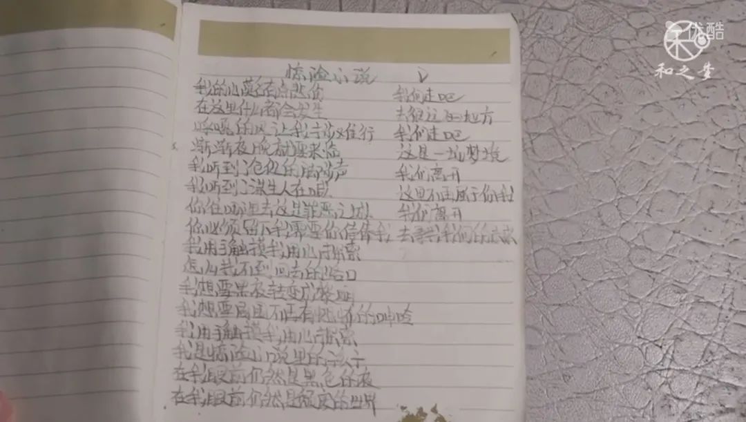 紀錄片導演張景百慧在拍攝龐麥郎的紀錄片時翻到了他的歌本,他看到一首《驚險小説》的歌詞是這樣寫的:
