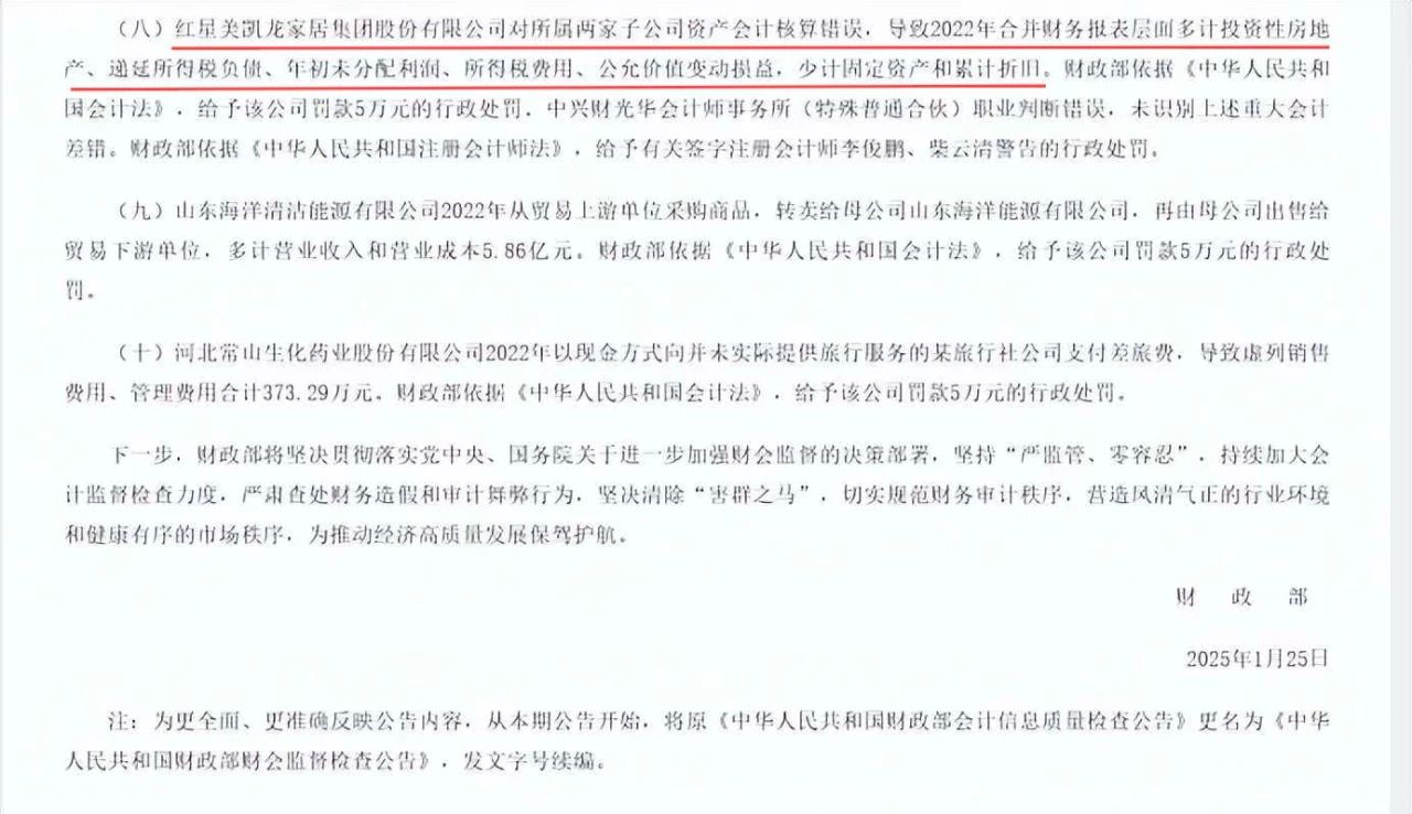 外界估計也想不到,即便財務報表難看至此,財務數據里居然還藏着“水分”。財政部監督評價局1月25日發佈過一份公告。公告明確,財政部2023年組織有關監管局,對41家備案從事證券服務業務的會計師事務所開展執業質量檢查,並延伸檢查89户企業的會計信息質量。結果發現,美凱龍對所屬兩家子公司資產會計核算錯誤,導致2022年合併財務報表層面多計投資性房地產、遞延所得税負債、年初未分配利潤、所得税費用、公允價值變動損益,少計固定資產和累計折舊。