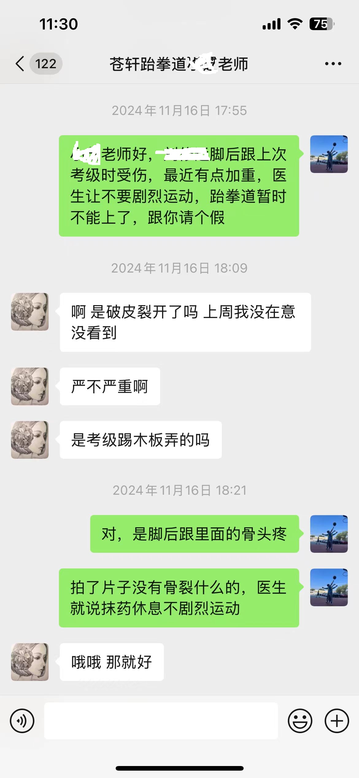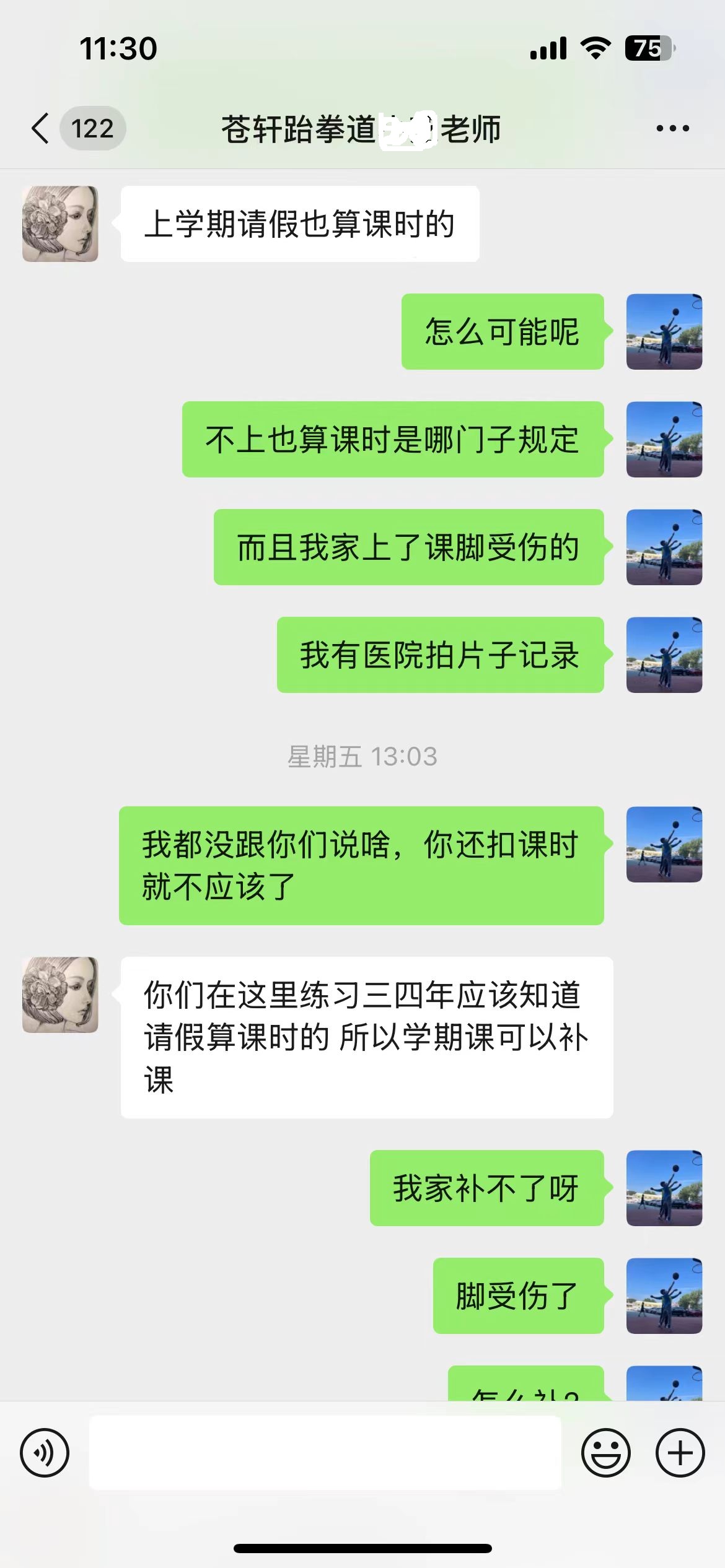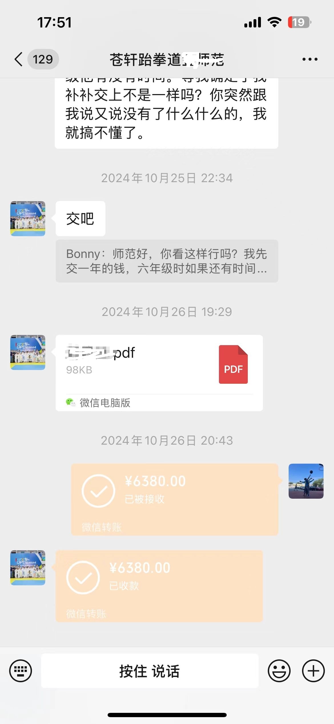 我兒子從2021年吧開始在這個跆拳道館培訓。之前一直上得好好的。2024年在蒼軒力源跆拳道館預繳一年38次跆拳道課時費6380元,沒有開發票和收據,但是有微信轉賬記錄。